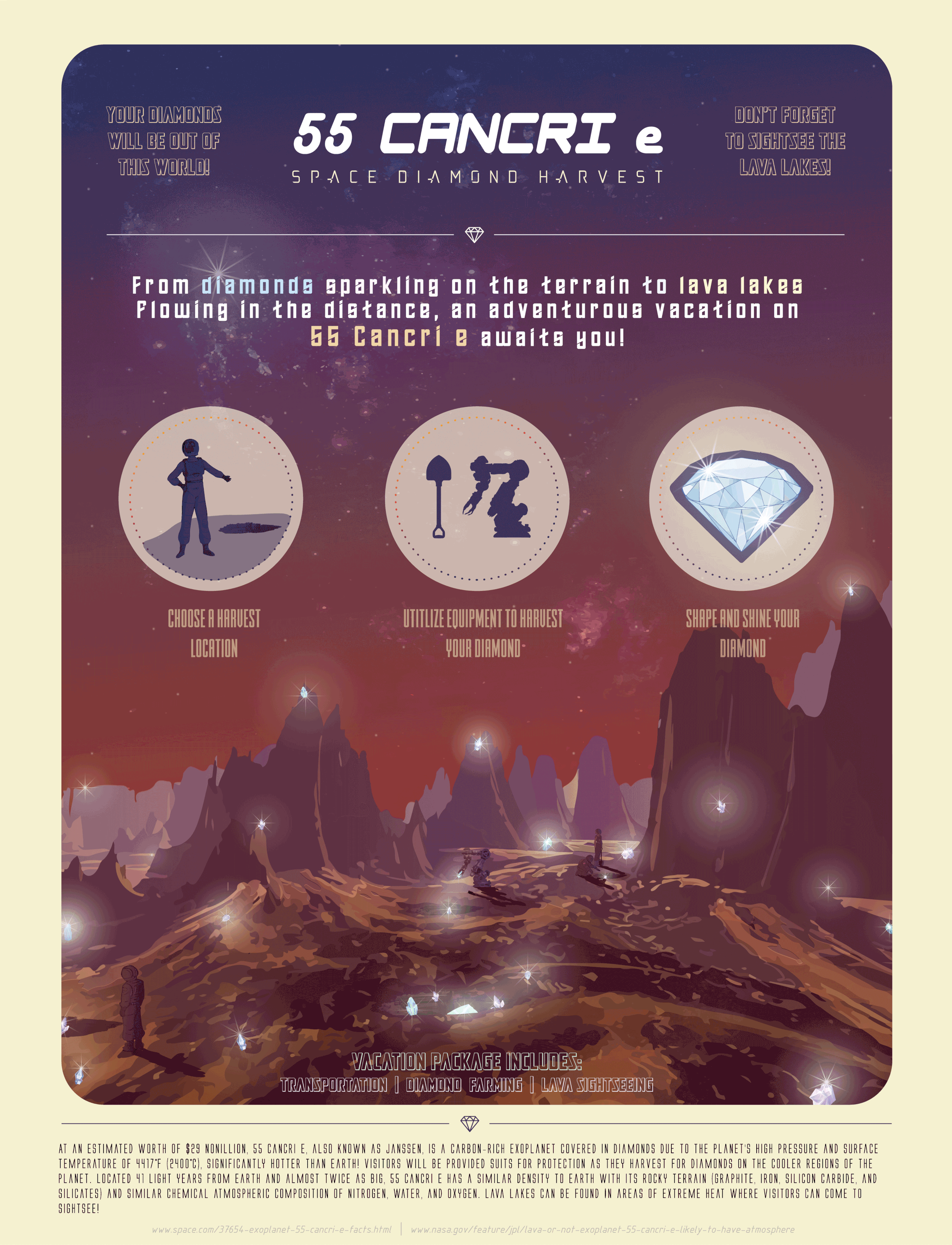 This piece is a fictional travel poster to the exoplanet, 55 Cancri e - also known as Janssen. Located 41 light years from earth and almost twice as big, this exoplanet is carbon-rich and believed to have diamonds on its surface and as well as its core - due to its pressure and high average surface temperature of 2400°C. With diamonds on earth gradually depleting, visitors will now have the opportunity to harvest their very own space diamond! They will be provided with protective suits as they harvest diamonds on the cooler regions of the planet. With a similar density to earth, this planet is believed to have a rocky terrain – with compounds such as graphite, iron, silicates, and silicon carbide. Lava lakes can also be found in areas of extreme heat where visitors can come to sightsee.